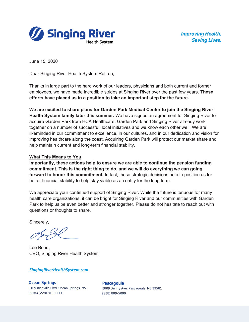 I received the attached letter (see below) from Singing River Health System this morning with a request that it be shared with you. Please see below for news from SRHS.