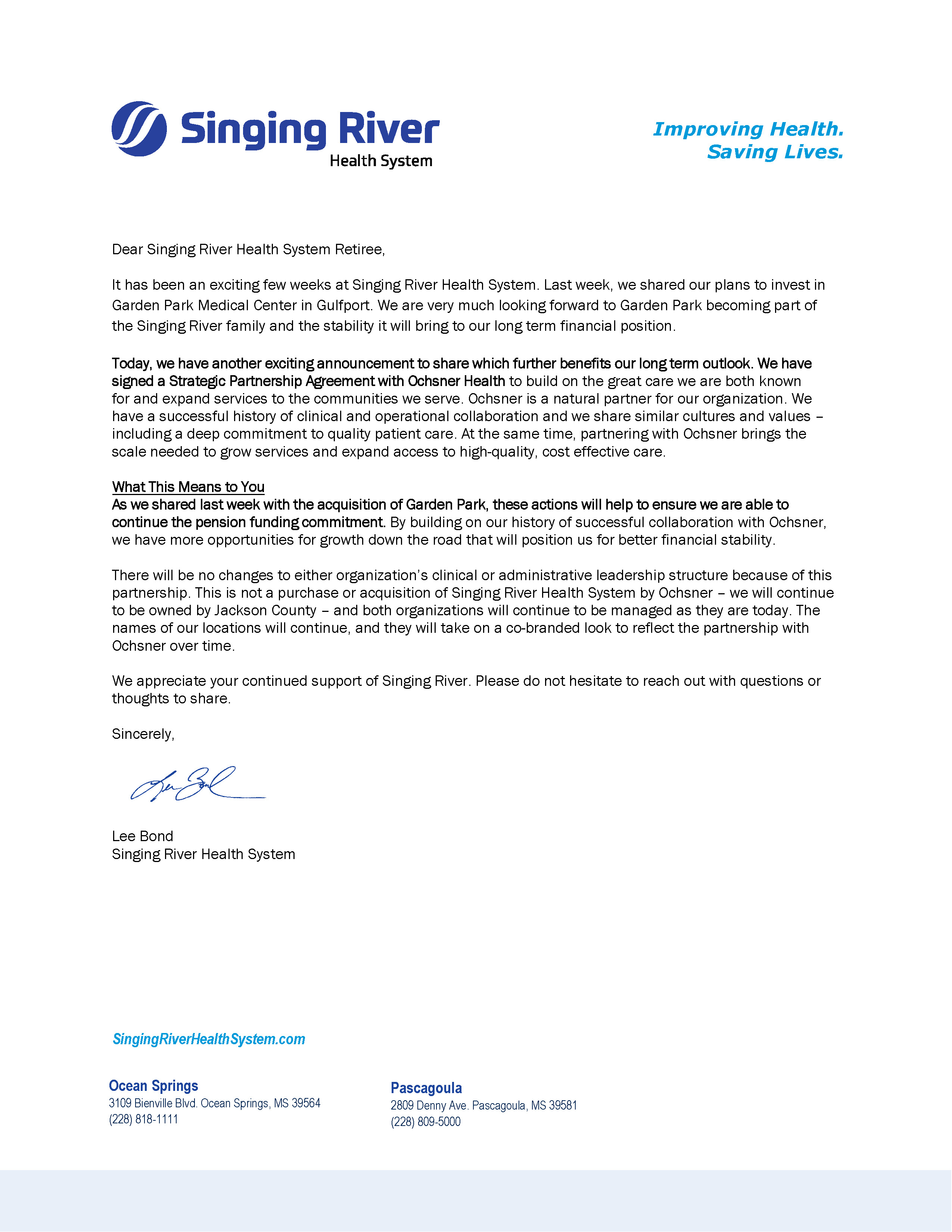 I received the attached letter (below) from Singing River Health System this morning with a request that it be shared with you. Please see below for more news from SRHS.
